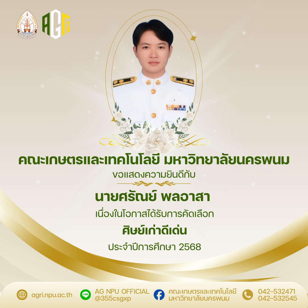 คณะเกษตรและเทคโนโลยี มหาวิทยาลัยนครพนม ขอแสดงความยินดีกับศิษย์เก่า เนื่องในโอกาสได้รับคัดเลือกเป็น “ศิษย์เก่าดีเด่น” ประจำปีการศึกษา 2568