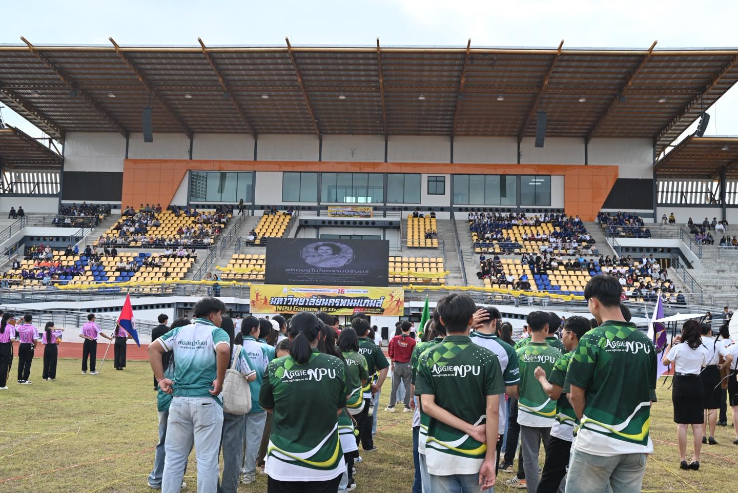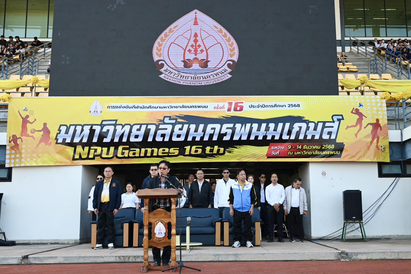 วันที่ 9 ธันวาคม 2568 ผู้ช่วยศาสตราจารย์ ดร.เสาวคนธ์ เหมวงษ์ คณบดีคณะเกษตรและเทคโนโลยี มหาวิทยาลัยนครพนม พร้อมด้วยผู้บริหาร บุคลากร และนักศึกษา เข้าร่วมพิธีเปิดงาน “กีฬามหาวิทยาลัยนครพนม เกมส์ ครั้งที่ 16” ณ สนามกีฬา NPU Stadium โดยมีนักศึกษาคณะฯ ร่วมเดินขบวนพาเหรดและแสดงฟาดแส้ในพิธีเปิด