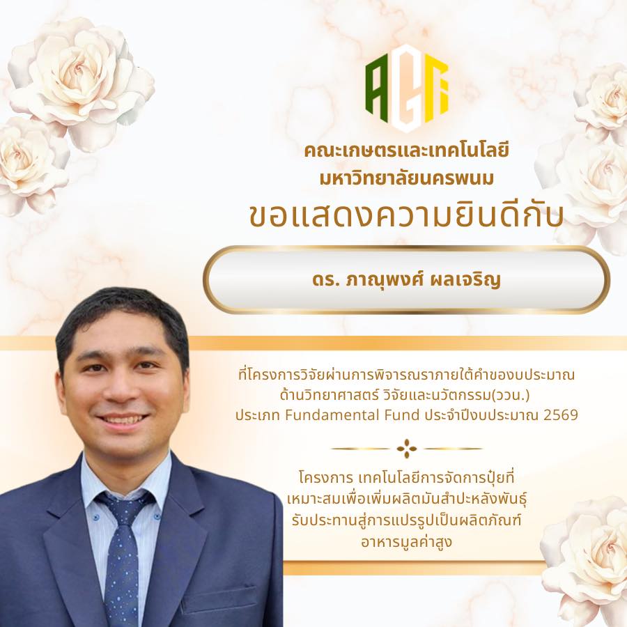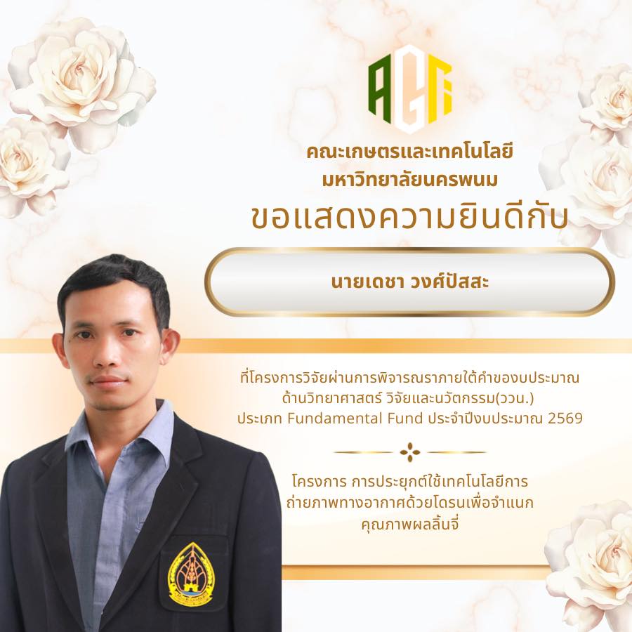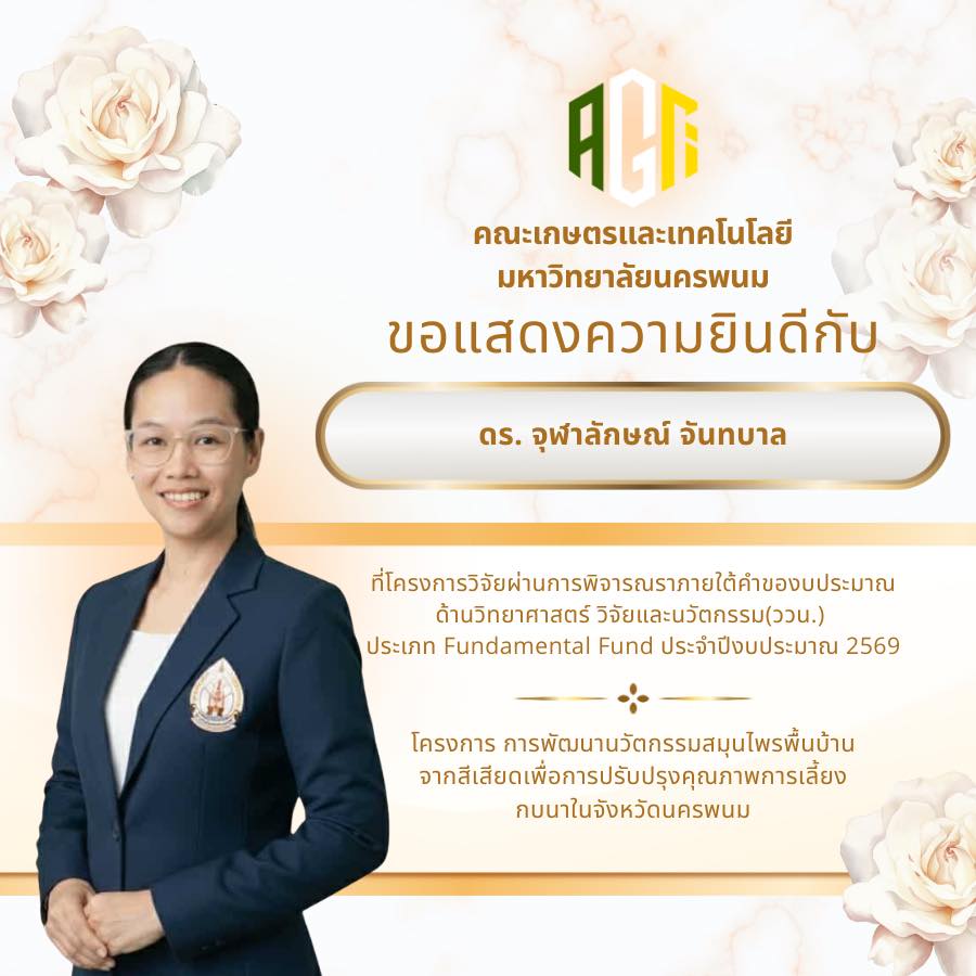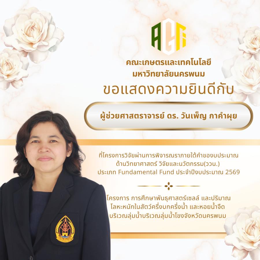คณะเกษตรและเทคโนโลยี มหาวิทยาลัยนครพนม ขอแสดงความยินดีกับบุคลากรทุกท่านที่โครงการวิจัยได้รับการอนุมัติภายใต้คำของบประมาณด้านวิทยาศาสตร์ วิจัยและนวัตกรรม (ววน.) ประเภท Fundamental Fund ประจำปีงบประมาณ 2569