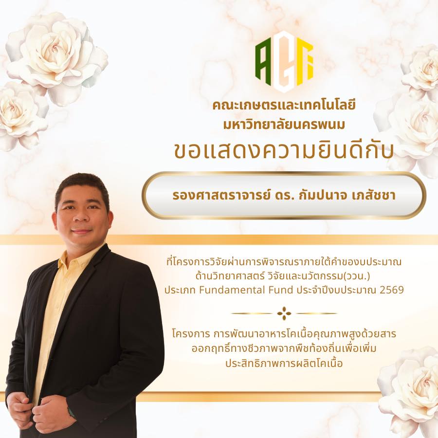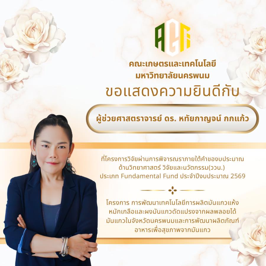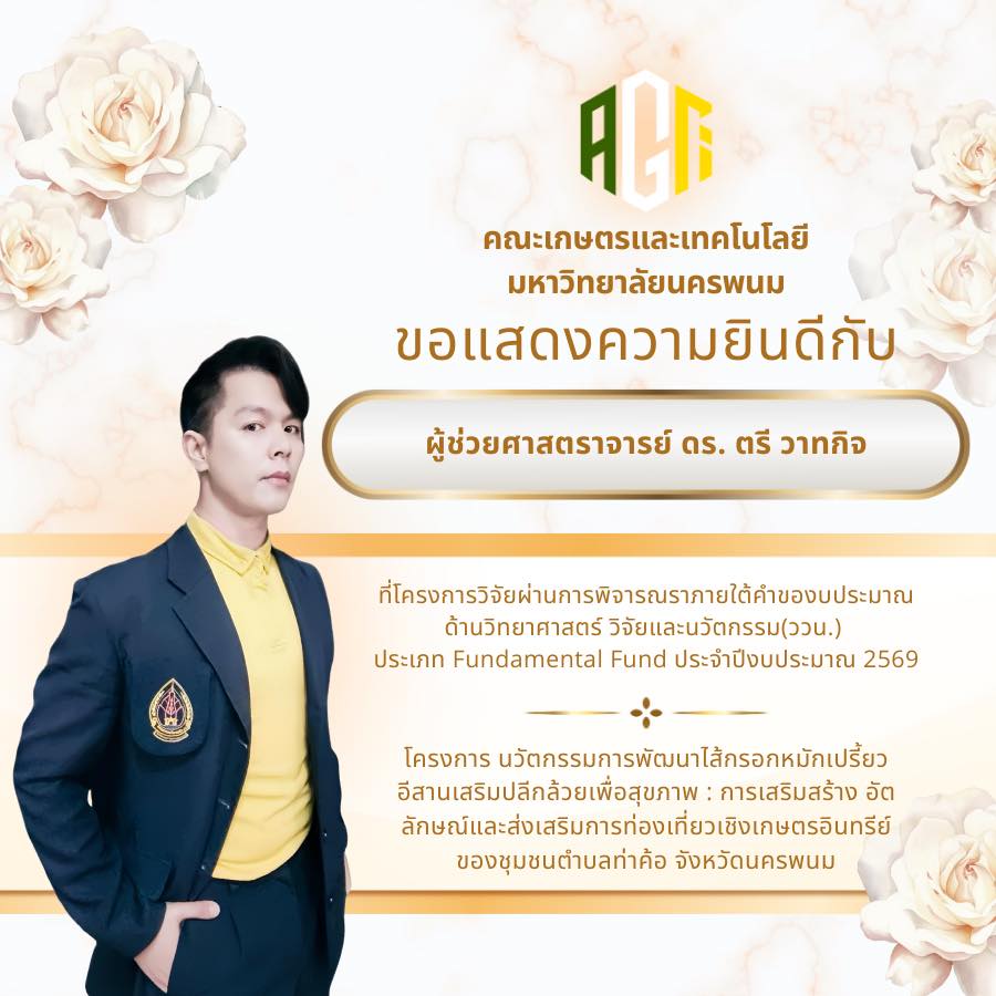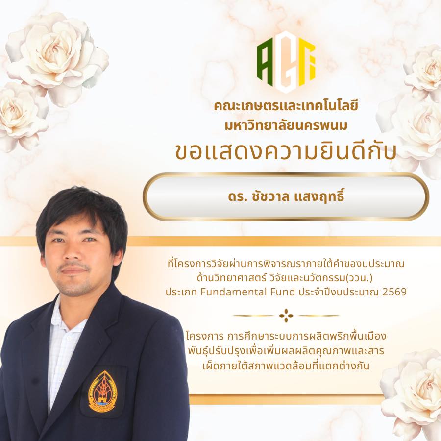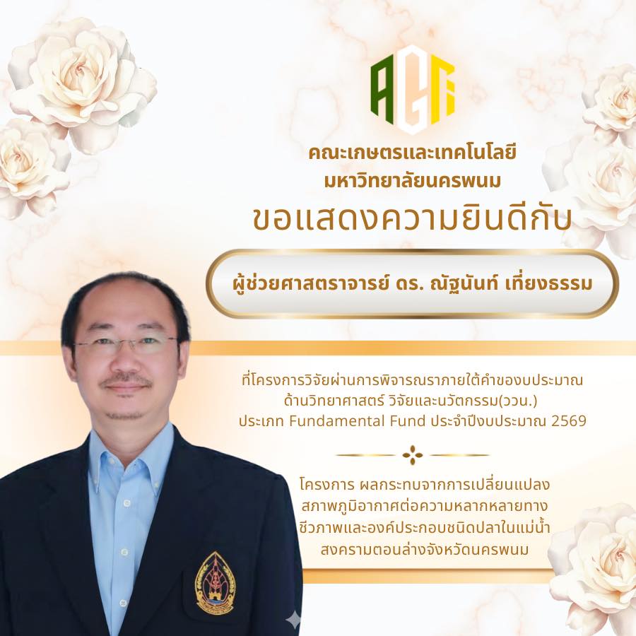 คณะเกษตรและเทคโนโลยี มหาวิทยาลัยนครพนม ขอแสดงความยินดีกับบุคลากรทุกท่านที่โครงการวิจัยได้รับการอนุมัติภายใต้คำของบประมาณด้านวิทยาศาสตร์ วิจัยและนวัตกรรม (ววน.) ประเภท Fundamental Fund ประจำปีงบประมาณ 2569