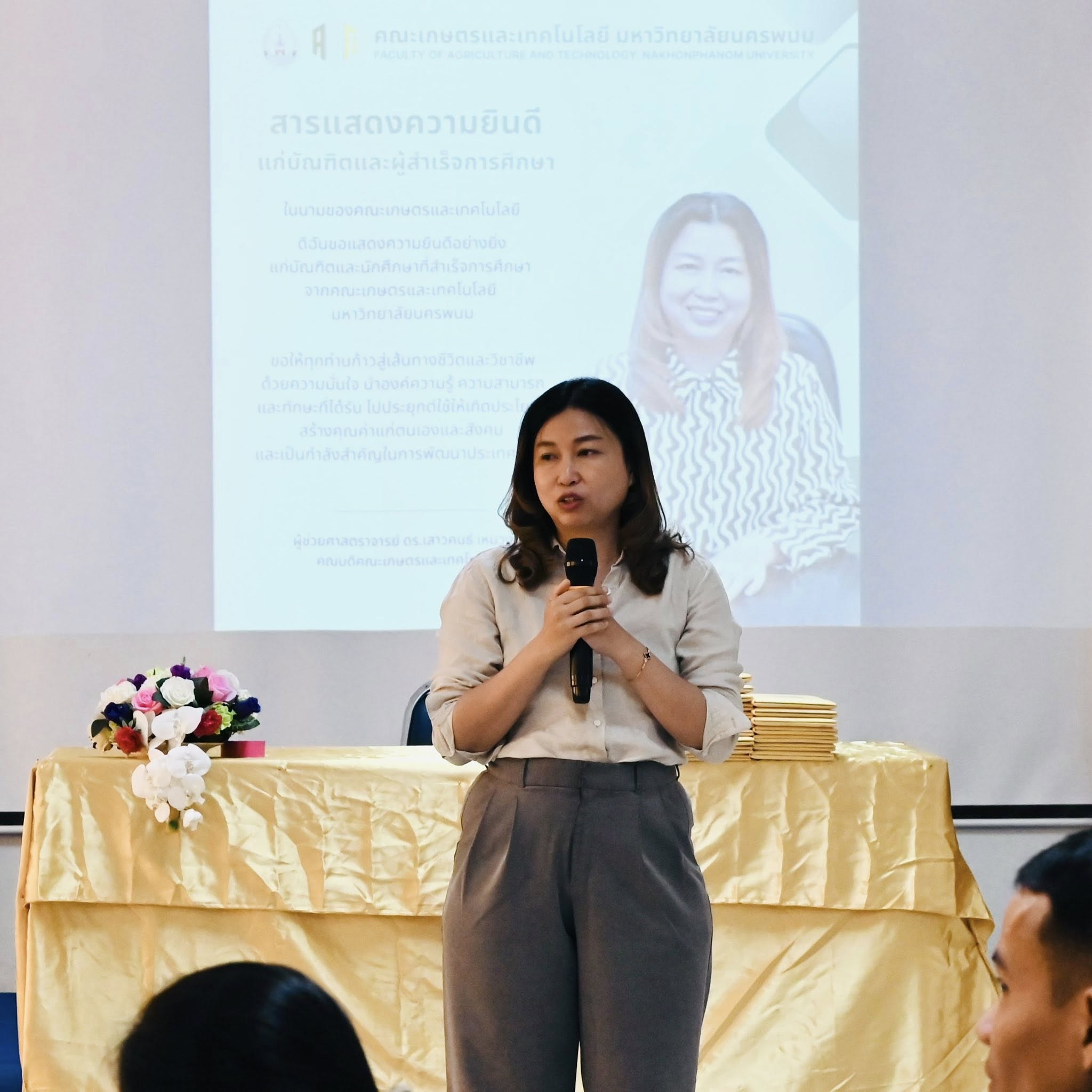 ในโอกาสนี้ ผู้ช่วยศาสตราจารย์ ดร.เสาวคนธ์ เหมวงษ์ คณบดีคณะเกษตรและเทคโนโลยี ได้กล่าวต้อนรับบัณฑิต พร้อมให้โอวาทและกำลังใจแก่ผู้สำเร็จการศึกษา ก่อนเข้ารับพระราชทานปริญญาบัตร